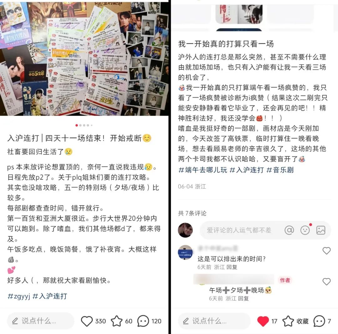 在小红书平台上,有不少剧迷分享了自己的跨城观演经历:有剧迷入沪连打(指连续看多部音乐剧或其他戏剧作品),8天看了9场演出,购买门票花费总计约4000元;还有剧迷跨城看演出,一天看三场,从午场到晚场再到午夜场。