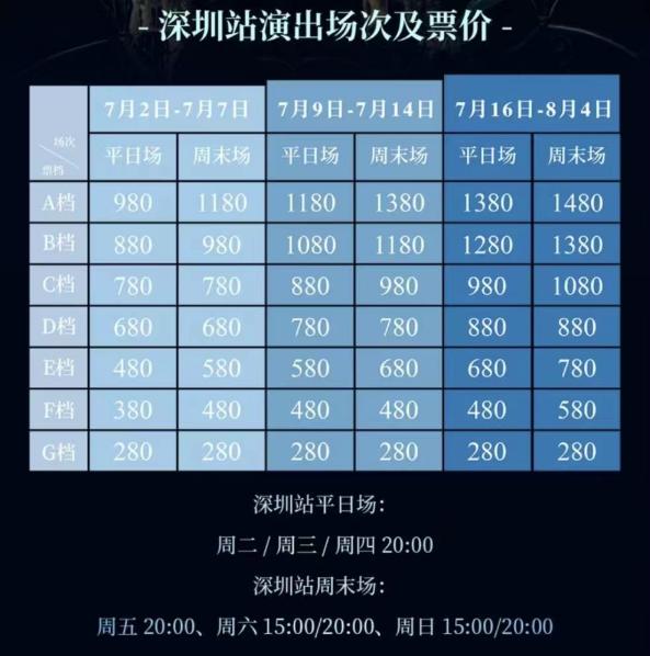 一般来说,音乐剧的平日场票价会比周末场要稍低一些。但随着开演时间越晚,票价却越贵的情况却是罕见。根据官宣的票价信息显示,《歌剧魅影》深圳场在7月16日到8月4日场次的A档、B档票价比7月2日到7月7日的票价要高出400元。对此,不少剧迷朋友都觉得“这样子卖票真的很抽象”“看不懂,割韭菜也不是这么割的”。