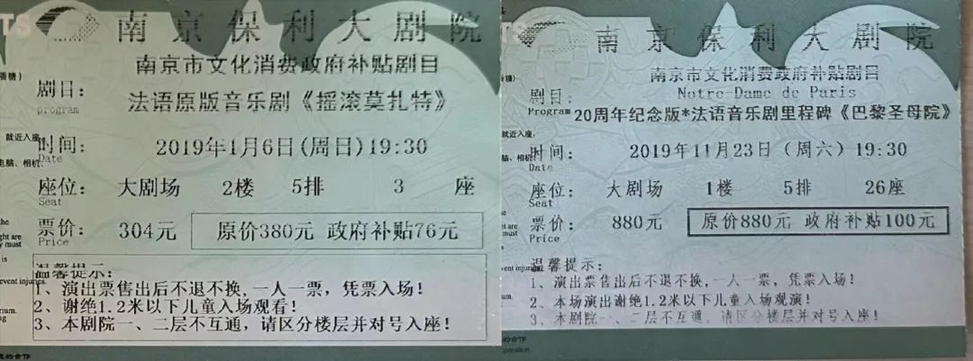 在几年前,音乐剧的票价则“亲民”得多。有剧迷翻看法剧《摇滚莫扎特》2019年巡演时的票根发现,在南京保利大剧场,2楼5排只需要304元,比今年深圳保利同等位置票价的一半还低。另外作为南京市文化消费政府补贴的剧目,1楼5排只需要780元。即便在没有补贴的北京天桥艺术中心,2019年巡演时以980元就能买到1楼3排的座位。