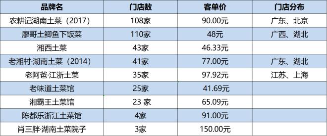 如北京有农耕记·湖南土菜、江西土菜馆、湘本味·围炉土菜;上海有徽记土菜、南陵人家经典土菜、山沟沟土菜馆;广州则有张家界土菜馆、洞庭土菜馆、湖南土菜馆;西安有建辉湖南土菜馆、民间粮仓土菜馆;成都有有滋有味土菜馆、简朴寨土菜馆、乡巴佬土菜馆。