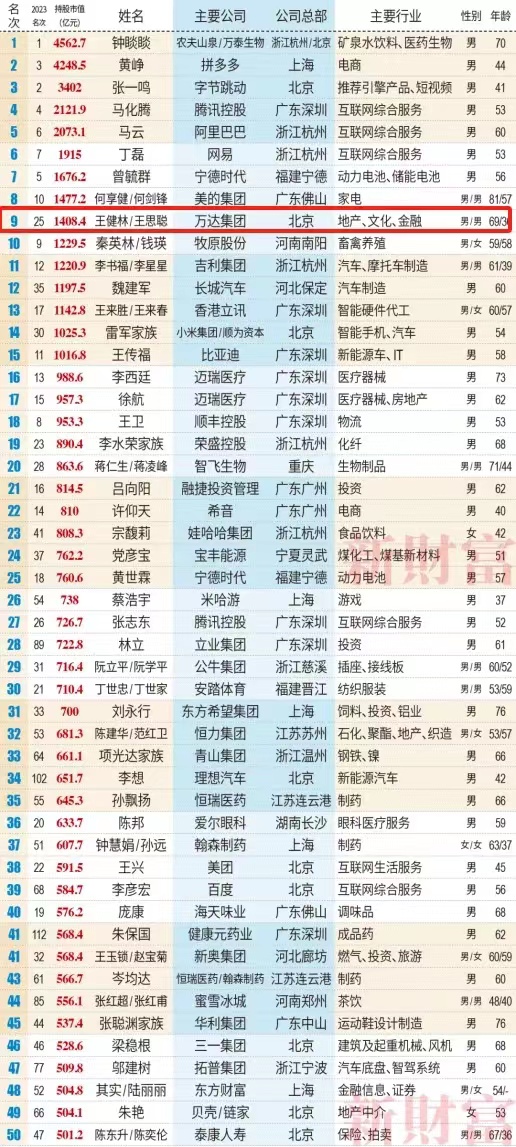 最新富豪榜出炉,王健林父子以1406亿元的总身家,重新回归前十。