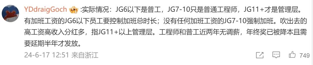 JG6以下是普工,JG7-10只是普通工程师,JG11+才是管理层。有加班工资的JG6以下员工要控制加班总时长;没有任何加班工资的JG7-10强制加班。