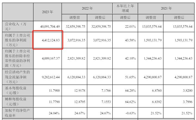 2023年,宁德时代实现营业收入4009.2亿元,同比增长22.01%;归母净利润441.21亿元,同比增长43.58%。
