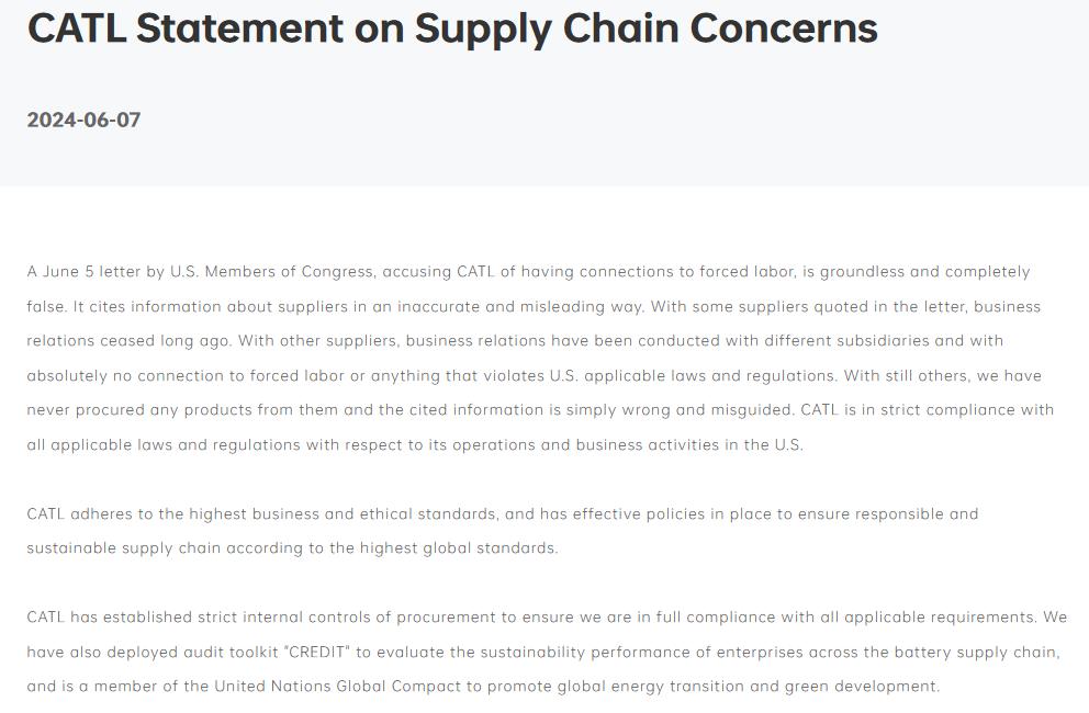 6月7日,宁德时代官网发了封声明,表示美国国会议员6月5日的一封信,指控宁德时代与强迫劳动有联系,这是毫无根据和完全错误的。