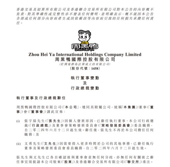 6月12日晚,周黑鸭(1458.HK)发布了一系列人事变动公告。核心变动为,原执行董事行政总裁及董事会策略发展委员会委员张宇晨,因个人发展原因辞任,周富裕重回一线,接任张宇晨。就在前一天,周富裕在社交视频平台公开称“周黑鸭要重回经典。”