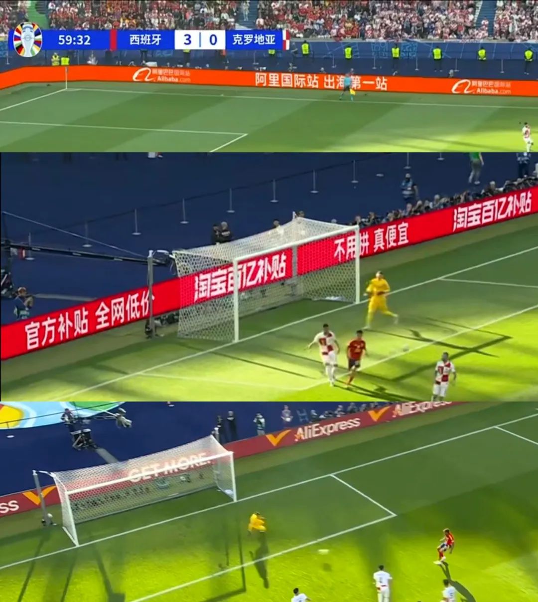 不妨举一个简单的例子:6月16日西班牙对阵克罗地亚的比赛第60分钟,克罗地亚持球策动进攻,西班牙一众后卫玩命回追。此时,在直播的主机位镜头里,场边LED广告牌显示的是黑金色的「蚂蚁财富黑卡」广告。可到了回放镜头里,同一时刻,场边广告牌却变成了蓝白色的「Alipay+」广告。