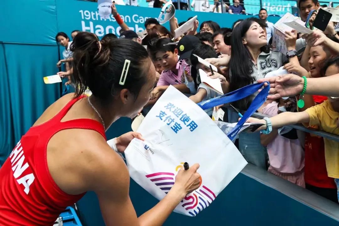 举一个不那么贴的例子。去年杭州亚运会网球女单决赛,郑钦文在夺冠后给现场球迷签名。一位手边没带任何东西的球迷,拎起现场支付宝发给观众的手提袋去找郑钦文签字,于是,就有了下面这张照片。