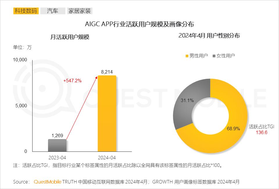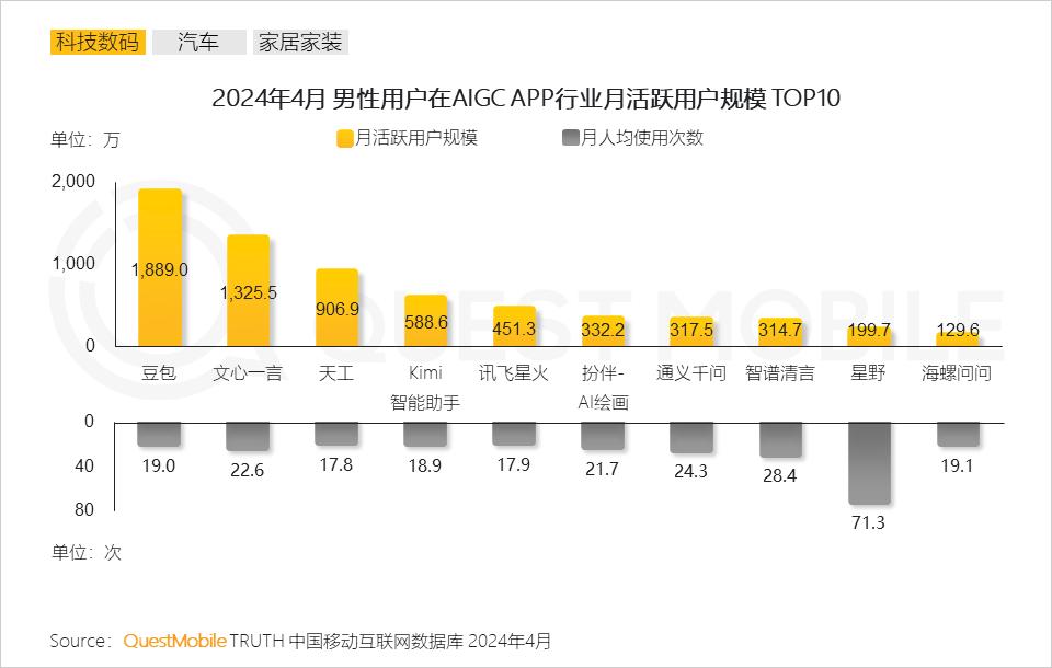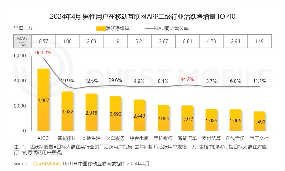 这当中,智能汽车、AIGC类男性用户非常突出,占比分别达到76.4%、68.9%,大家的探索欲,不仅助力了比亚迪、吉利汽车、上汽大众、小米汽车等车企高速增长,还让豆包、文心一言、天工等国内AIGC类APP用户活跃暴增!