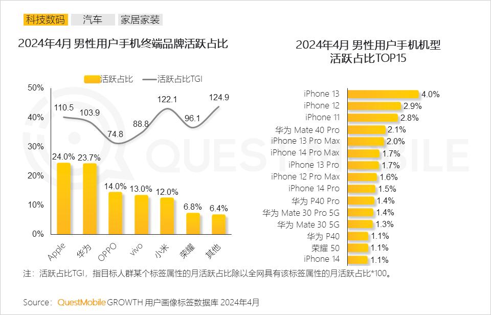 5、男性用户对小米、苹果、华为等手机品牌偏好突出,苹果与华为多款机型活跃规模占据前列