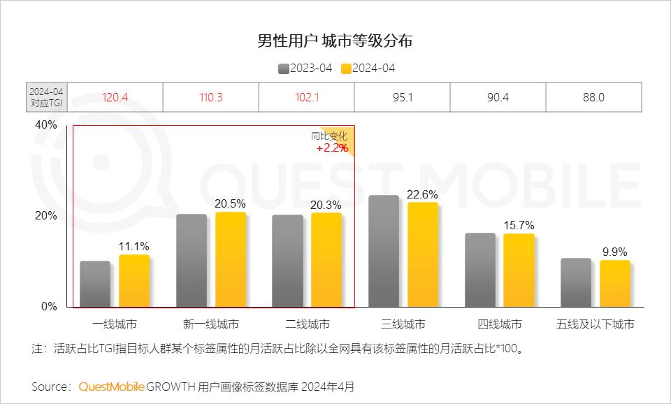 3、相较于全网用户,男性用户在二线及以上高线级城市占比突出,且呈现继续增长态势