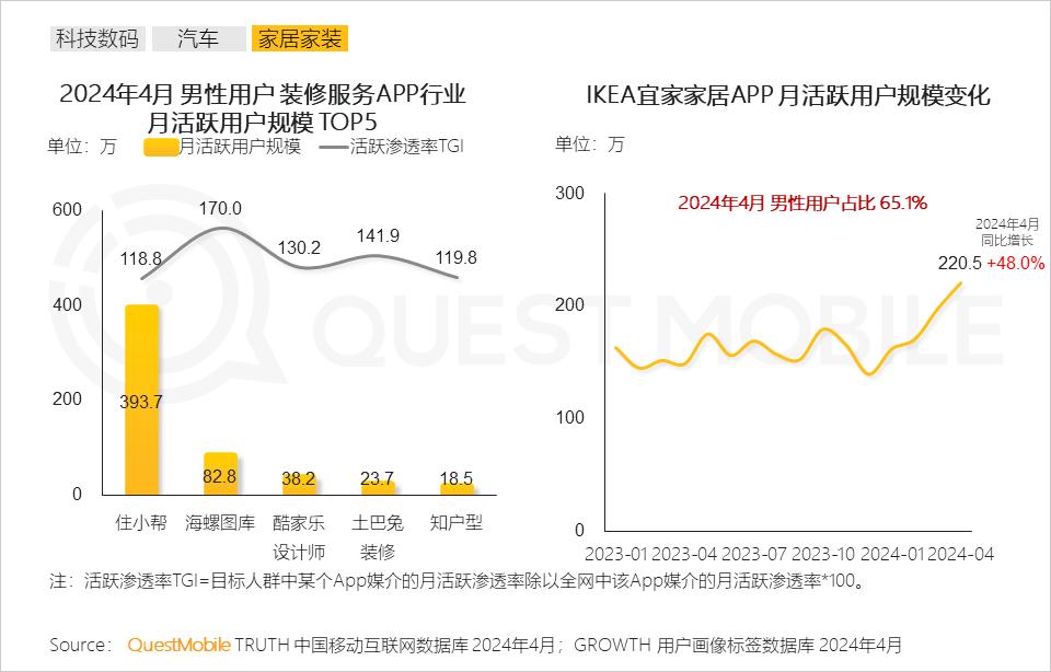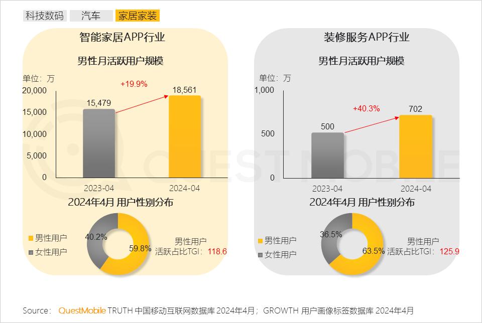 9、装修服务与智能家居应用中男性用户占比突出,凸显其在家庭家装领域的积极参与和决策影响力