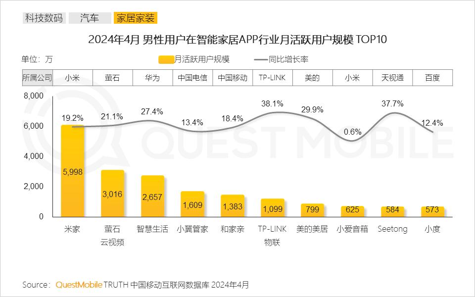 QuestMobile数据显示,2024年4月,米家、萤石云视频、智慧生活等头部智能家居APP男性活跃用户规模均实现双位数增长。