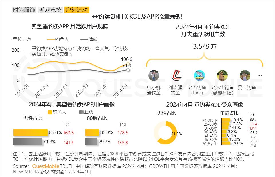QuestMobile数据显示,垂钓类APP用户以男性、80后为主,与此同时,垂钓类KOL分享钓鱼相关内容吸引超3,500万用户线上围观,25-35岁年龄段年轻用户偏好突出。