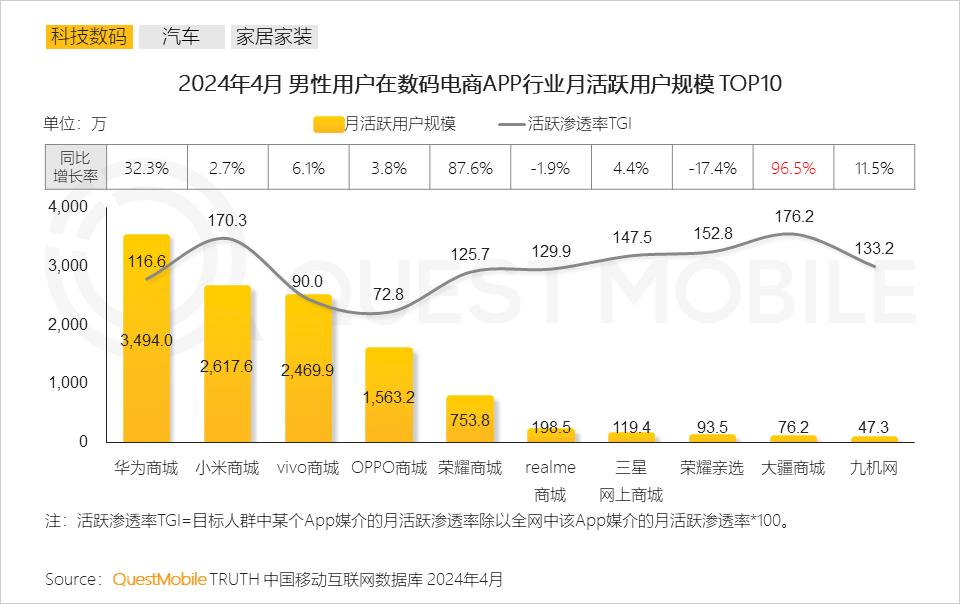 QuestMobile数据显示,2024年4月,大疆商城男性活跃用户规模达76.2万,同比增长96.5%。