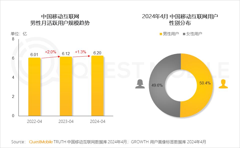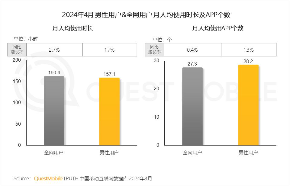 QuestMobile数据显示,2024年4月,男性用户月人均使用时长达157.1小时,APP使用个数达28.2个,分别提升1.7%、1.3%。