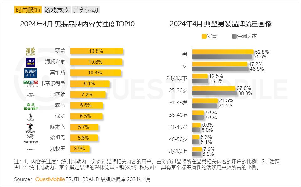 罗蒙、海澜之家等国货男装品牌内容关注度跻身前列;罗蒙、海澜之家品牌流量画像相似度较高,男性、25-35岁年龄段用户为主流人群。