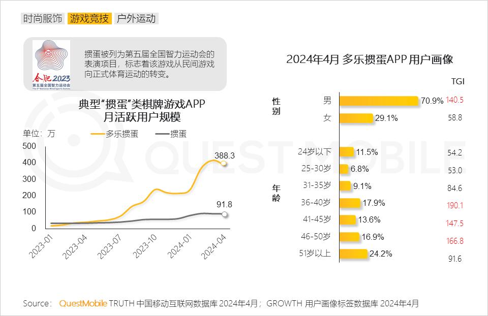 QuestMobile数据显示,多乐掼蛋、掼蛋APP过去一年流量迎来大幅提升,截止到2024年4月,月活跃用户规模分别达到388.3万和91.8万,用户群体以男性、35岁以上年龄段为主。
