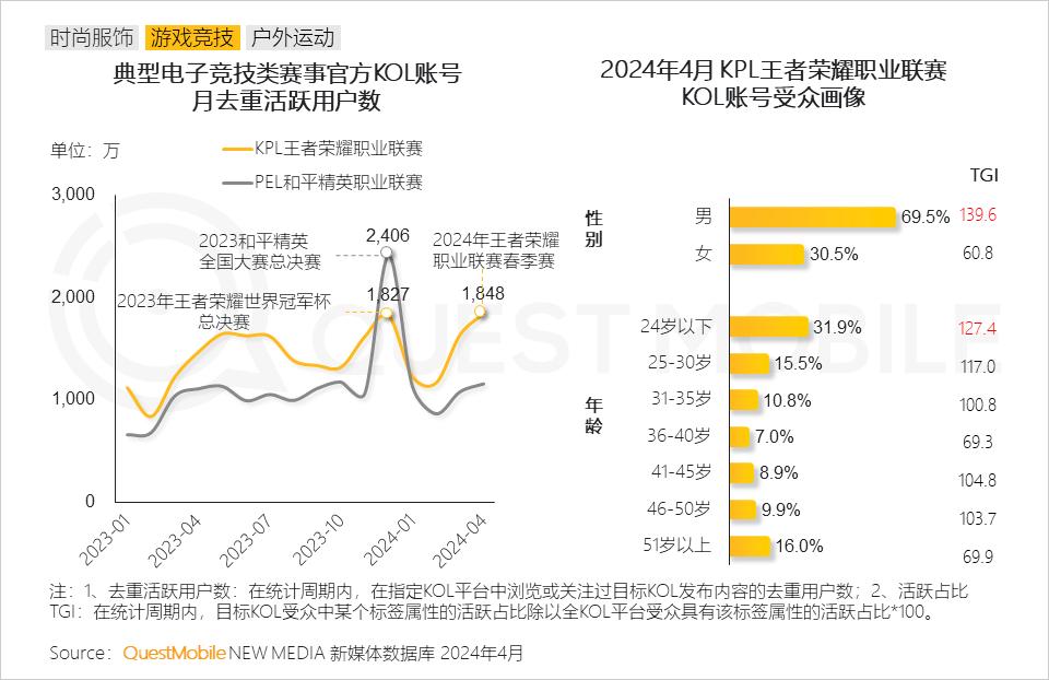王者荣耀、和平精英职业联赛关键赛段引关注峰值,年轻男性用户为核心驱动力。