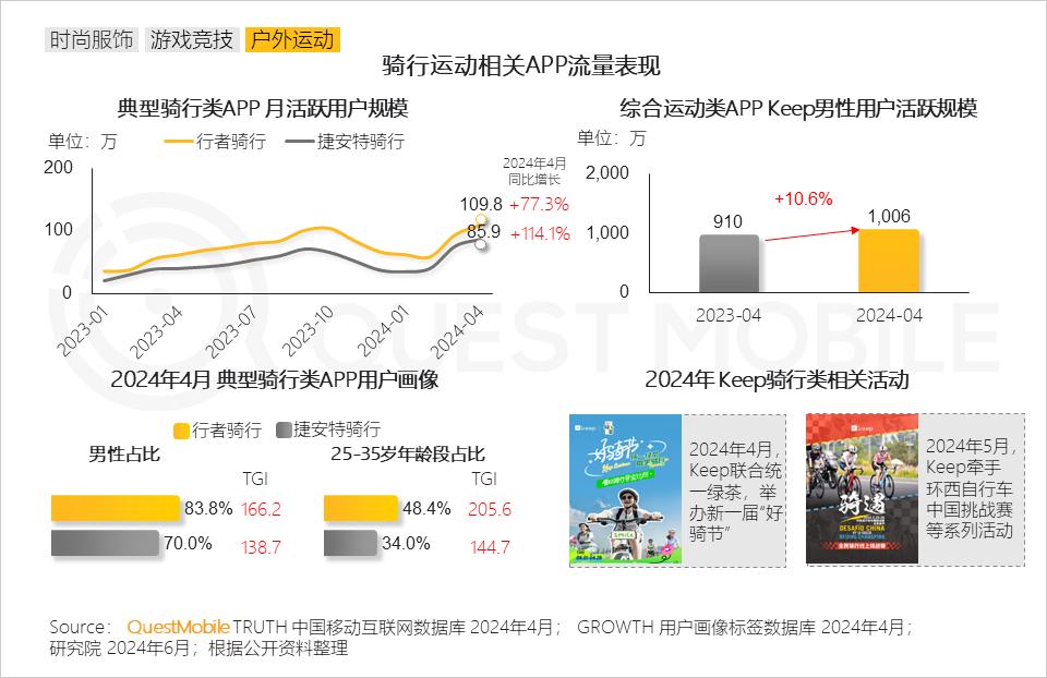 骑行运动热潮下,行者骑行、捷安特骑行APP月活跃用户规模分别增长77.3%、114.1%,25-35岁、男性用户为主流人群;综合运动类APP积极拓展骑行领域,解锁多元运动体验,Keep男性活跃用户规模突破1,000万。