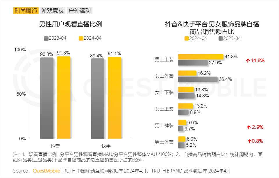 QuestMobile数据显示,2024年4月,抖音、快手平台男性用户观看直播比例分别达到91.8%、91.1%;男女服饰品牌自播商品销售额比例上,男性相关品类占比提升明显。