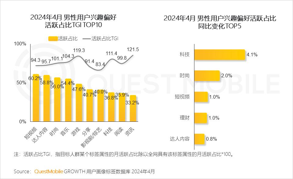 QuestMobile数据显示,截止到2024年4月,移动互联网男性用户月活规模已经达到6.2亿,月人均使用时长达到157.1小时,并且主要用在了短视频、达人内容、时尚、音乐、游戏、分享、影综、科技等方面,堪称广泛且硬核。