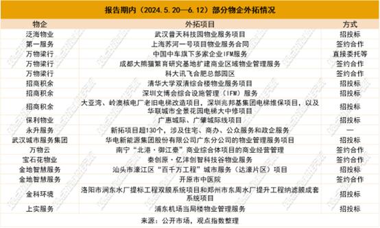 第三方外拓方面,期内延续了上个报告期的基本态势,均较为缓和。从企业方面来看,万物梁行、招商积余、金地智慧服务及保利物业均有不同程度的收获。其中金地智慧服务更是年初至今以来首次公布拓展成果。从拓展方式来看,招投标以及市场化合作仍旧扮演主流角色。同时,业态方面也涉及较广,包括了商办,住宅、医院、产业园、学校以及城轨等。