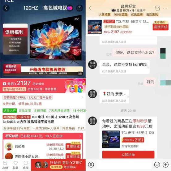 以6·18促销期间一款TCL 65英寸120Hz电视为例(拼多多未标明型号),售价2199元(不含券)。通过模具判断,该机型是TCL V8系列电视,其参数配置包括4K分辨率、3+64GB内存、120Hz刷新率等,但商品详情页未标注HDR,《华尔街科技眼》反复询问客服后也确认,拼多多售卖的该款电视不支持该功能。