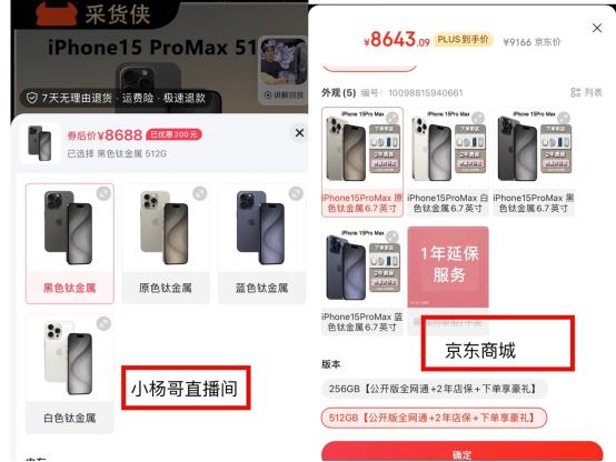 实际上,和拼多多推崇低配的初衷类似,直播间充斥着山寨商品还是为了形成“低价假象”。要知道,对于标准化产品,直播间的东西并无价格优势。以iPhone 15 Pro Max(512GB)为例,小杨哥直播间售价8688元,京东商场则为8643元。
