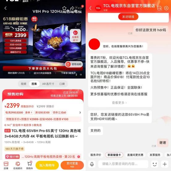 同样的款式,再来看看京东的情况。京东明确标注该机型为“TCL 65V8H Pro”,售价2399元,配置包括4K、3+64GB内存、120Hz等等,但与拼多多版本不同的是支持HDR功能。该功能不仅在商品详情页中有明确体现,客服也确认该机型支持HDR10功能。
