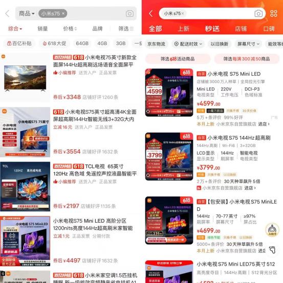 除了以阉割版家电体现价格竞争力,拼多多还善于通过算法,向消费者推荐入门款产品。再举一个例子, 近年来,为了应对多元化市场需求,各家电企业开始细分各系列产品,小米更是深谙消费需求。以小米S75系列电视为例,该系列包括基本版和Mini LED高配版两个版本。