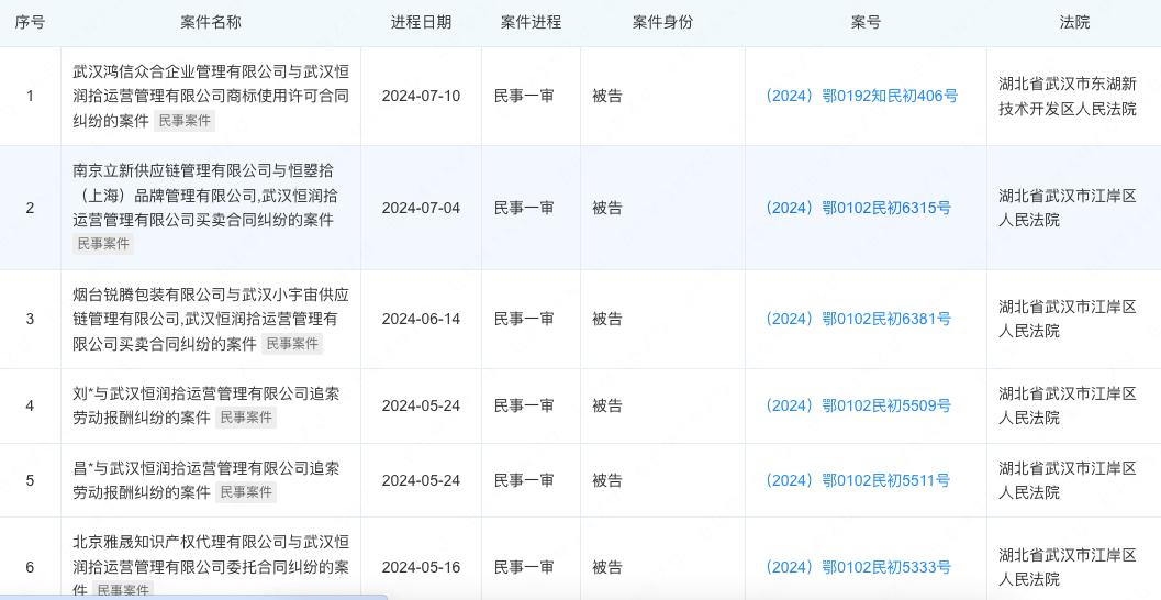 企查查信息显示,汉口二厂所属的武汉恒润拾运营管理有限公司(以下简称“武汉恒润拾”),目前共涉46桩作为被告的司法案件,其中,2023年后明显增多,集中于合作企业要求履约(多是欠账)的合同纠纷,以及公司员工讨薪的劳动争议。