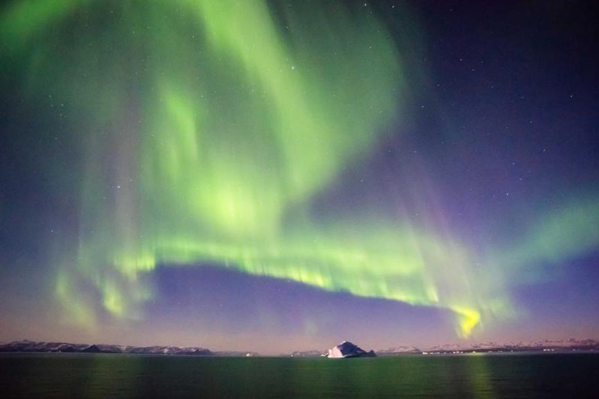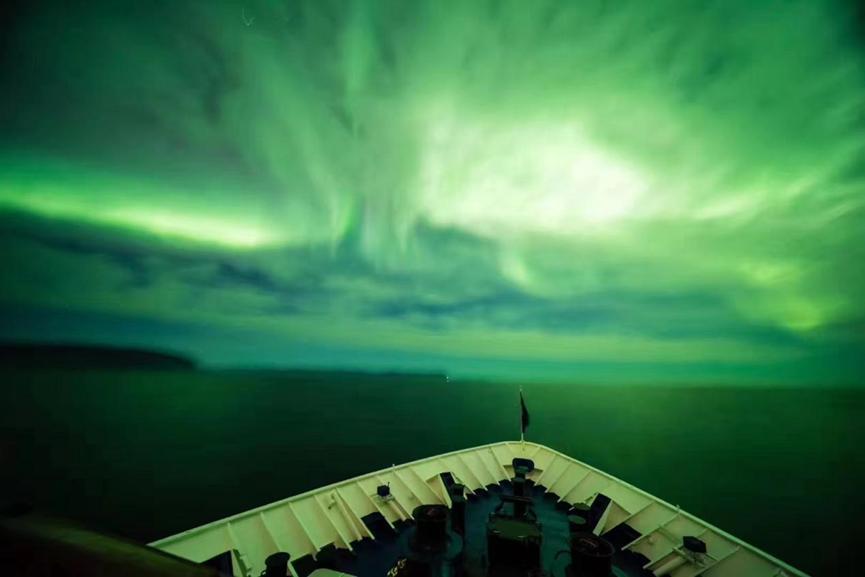 “海上的极光更为震撼,跃动的极光,在海面上也会映出来。整个天地都环绕在光带中。”
