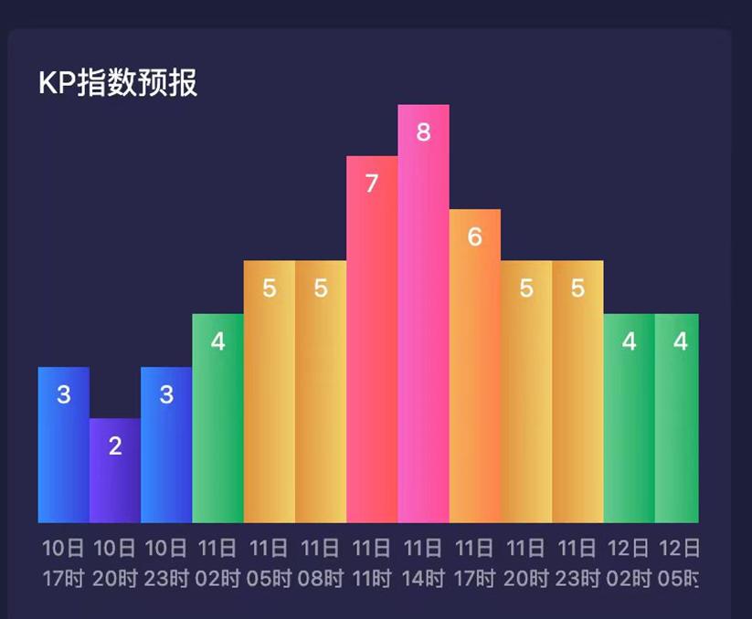 业内通常用地磁暴等级或kp值来预测极光的强度,一般情况下当地磁暴等级到达G2或kp6以上,高纬度地区就会出现很强的极光。