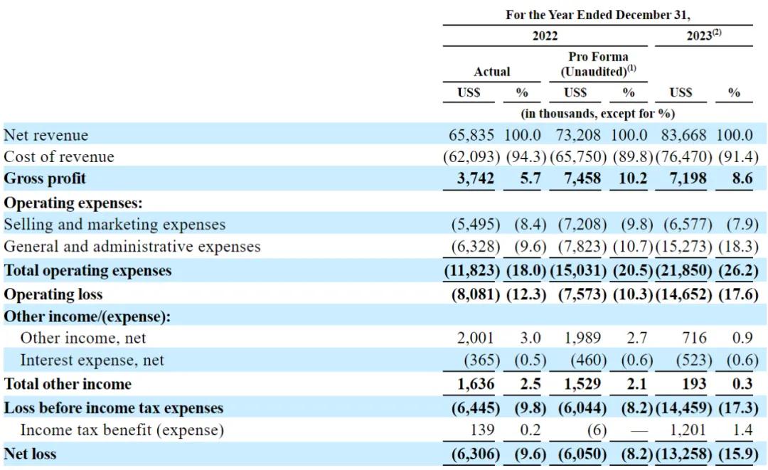 不过,聚光灯下的星竞威武也面临着盈利的考验。招股书显示,该公司净亏损从2022年的630万美元增加到2023年的1330万美元。而营收成本则从2022年的6210万美元攀升至2023年的7650万美元。