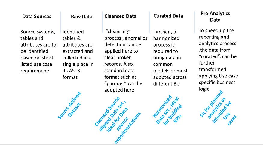 简而言之,我们需要制定策略,让数据从其来源“数据生产者”遍历或跳跃到“数据消费者”应用程序和系统。这方面最有效的方法是遵循如下图所示的路径:识别->收集->清理->整理->衍生 -
