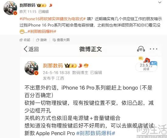 继此前有消息源透露,iPhone 16系列或将新增一枚通过触控来调整焦距的实体拍照键后,日前又有爆料称,有供应链相关人士暗示iPhone 16系列的两款Pro版机型可能会取消所有实体键、换用电容式触控键,但不会改变现有按键的位置和凸起程度。同时还有消息源指出,取消实体按键后的使用体验可参考新款Apple Pencil Pro。