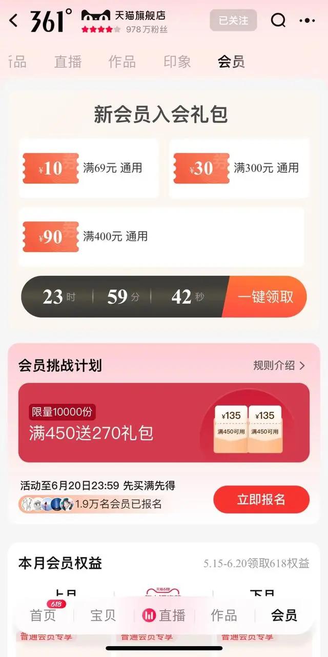 像运动品牌361度,大促首日会员GMV达到7908万元,同比激增1169%;会员GMV占比59%,同比提升29个百分点。361度电商相关负责人告诉媒体,品牌以发放大额优惠券和实物礼品等形式,通过多渠道召回了在近两年有购买记录、但还没有成为会员的老客户。