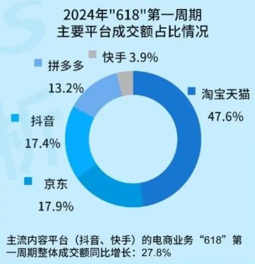 易观分析数据显示,今年618第一周期(5月20日-6月3日),以淘宝天猫、京东、拼多多为首的综合电商大盘GMV增速达到了14%,淘宝天猫第一波GMV同比增长14.6%。这一增速表现要好过去年同期。星图数据显示,2023年618期间,传统货架电商总的销售额为6124亿元,同比仅增长5.4%。