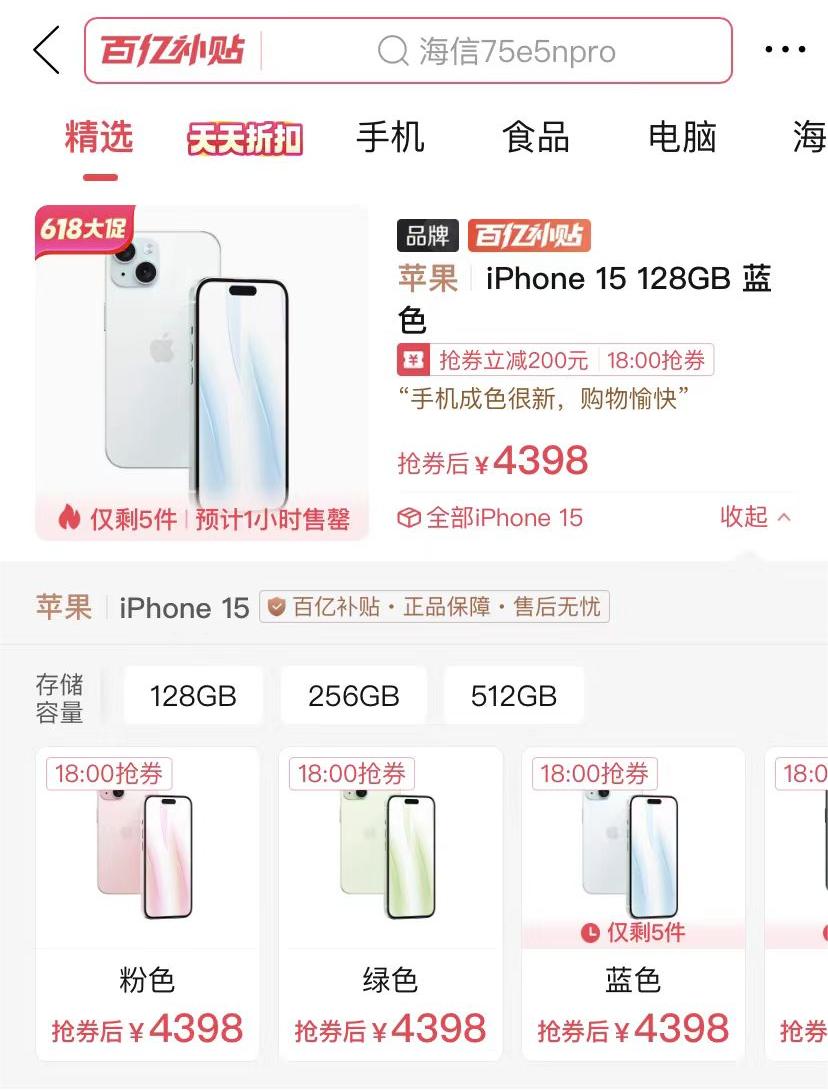 苹果618销量成绩好吗?确实很好,但这是用降价换来的。以iPhone 15 128GB版为例,天猫到手价为4599元,比苹果官网定价低了1400元;京东iPhone 15 128GB版到手价为4749元,PLUS会员折上折,到手还能再省40元;轮到势头正猛的拼多多,iPhone 15 128GB版到手价为4398元。