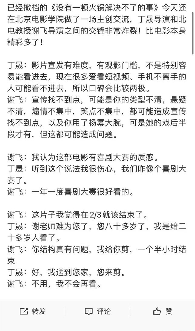 《没有一顿火锅解决不了的事》撤档前后,导演丁晟和谢飞教授在北大的对谈引起了一番热议。丁晟提到影片有观影门槛,宣发有难度。谢飞则回复,宣传找不到点,可能是影片类型不清,悬疑不清,煽情不集中,笑点不集中,以及用了杨幂,可是她的戏后半段才有。