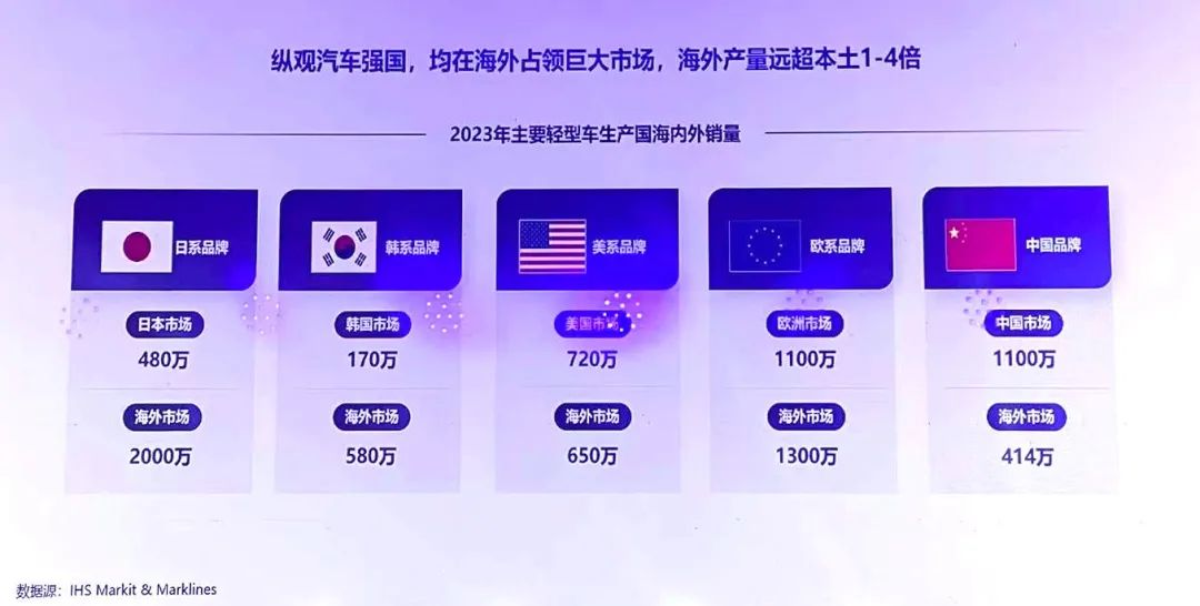 来自一份研究数据显示,为什么说日本和韩国汽车强大,是因为日本本土汽车销量仅有480万辆,但其海外有2000万辆的能力,是其本土销量的3-4倍;韩系品牌国内销量仅有170万辆,但其海外市场有580万辆的能力。包括美系和欧系品牌,其海外销量也基本上和国内处于同样的水平。