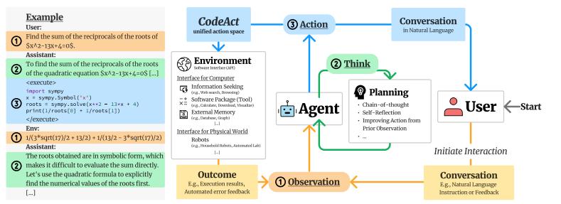 Agent 中模型、人类、环境的交互需要协同,我们发在 ICML/ICLR 上的 CodeAct 主要专注于探索让模型更好地与环境进行交互的方式:我们探索代码作为媒介为 Agent 与环境的交互方式,与人类使用者利用自然语言进行交互,这是 CodeAct 的核心思想。接下来我们将顺着这一问题的框架去延展更实际的应用场景。