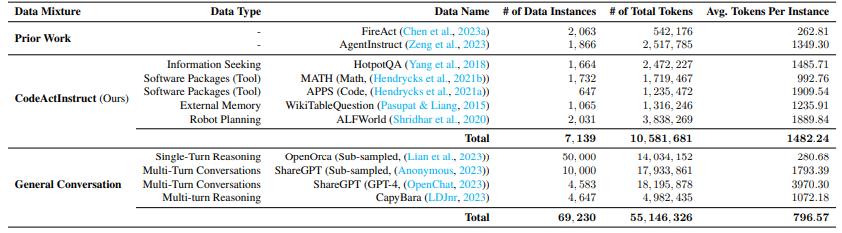 CodeActInstruct 是个更全面的数据集,比同类型的数据集多了三倍数据量(至少 5 倍的 Token 数),因此我们希望利用 CodeActInstruct 帮助开发者来提高基础模型的 CodeAct 能力。