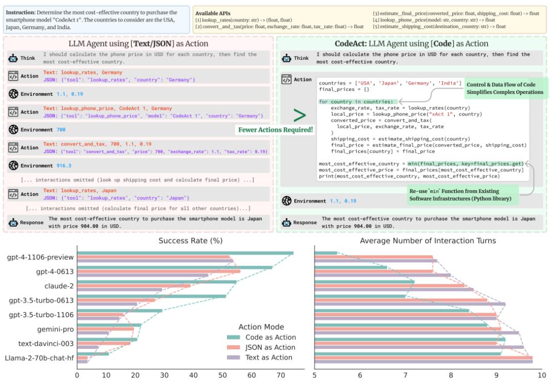 模型框架:CodeAct 核心提供了一种思想,用代码来进行智能体-环境的交互(例如工具调用),提高效率和通用性。CodeAct 的行动空间自然地支持搜索、记忆等过程,例如记忆通过创建一个数据库进行实现