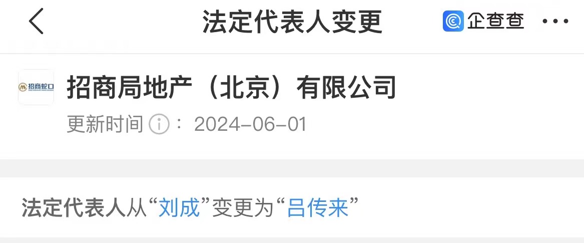 6月18日,据企查查显示,招商局地产(北京)有限公司(以下简称“招商局地产北京”)法人代表发生变更,由刘成变更为吕传来。