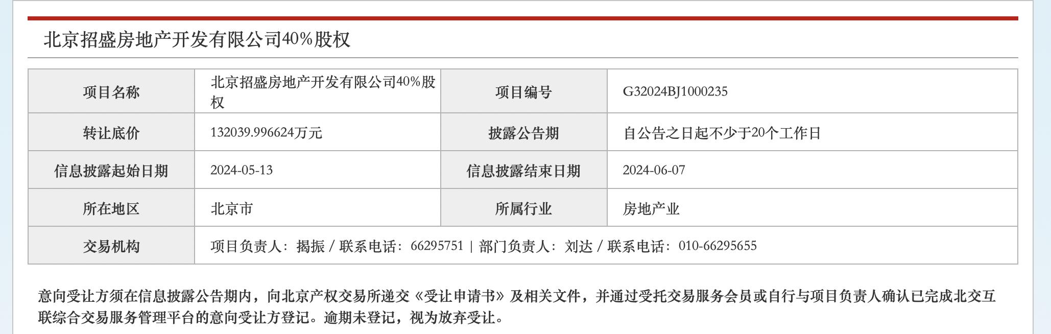今年5月12日,据北京产权交易所,北京招盛房地产开发有限公司(以下简称“北京招盛房地产”)40%股权挂牌转让,转让方为招商局地产北京,转让底价约为13.2亿元。