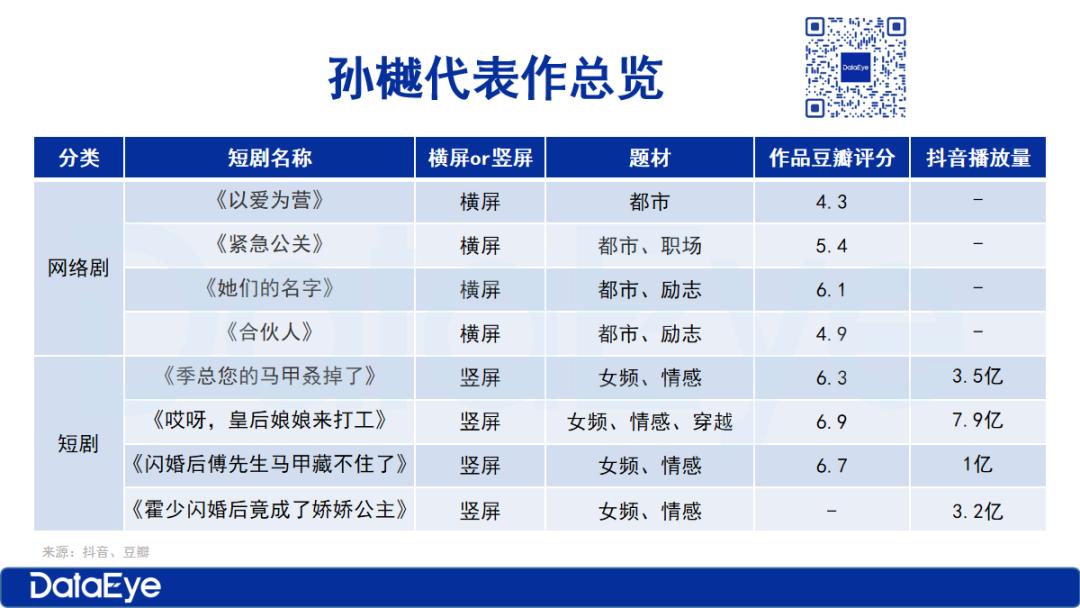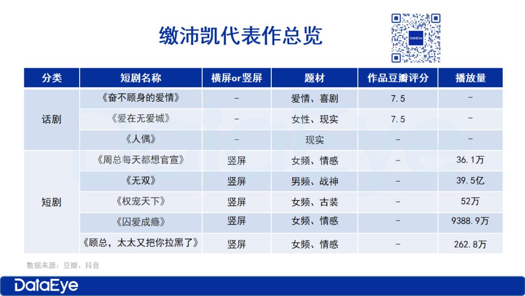其中最为出圈的是《哎呀,皇后娘娘来打工》,在抖音的播放量接近9亿。从粉丝影响力来看,其抖音粉丝量超过200W。从短剧作品来看,大部分为竖屏小程序短剧,以女频现代情感剧居多。