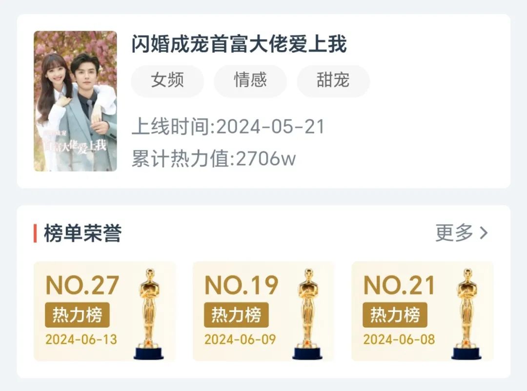 而后,她与何聪睿二搭出演女频霸总题材的小程序短剧《闪婚成宠首富大佬爱上我》再次爆火,累计热力值超2700W,抖音播放量高达1.4亿。