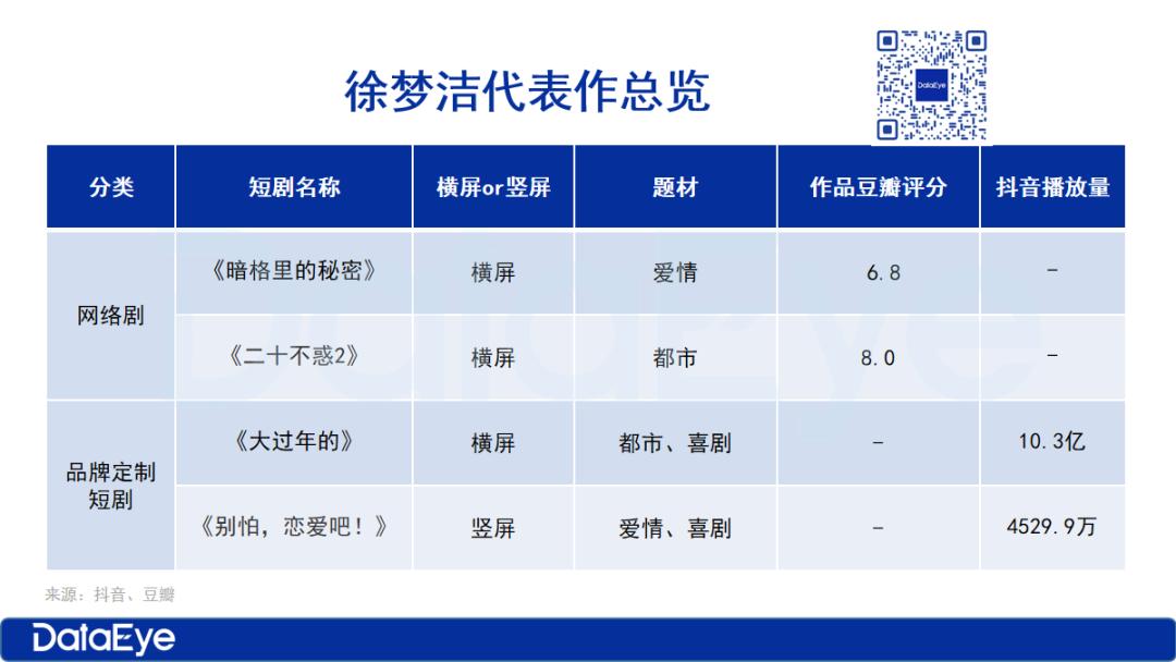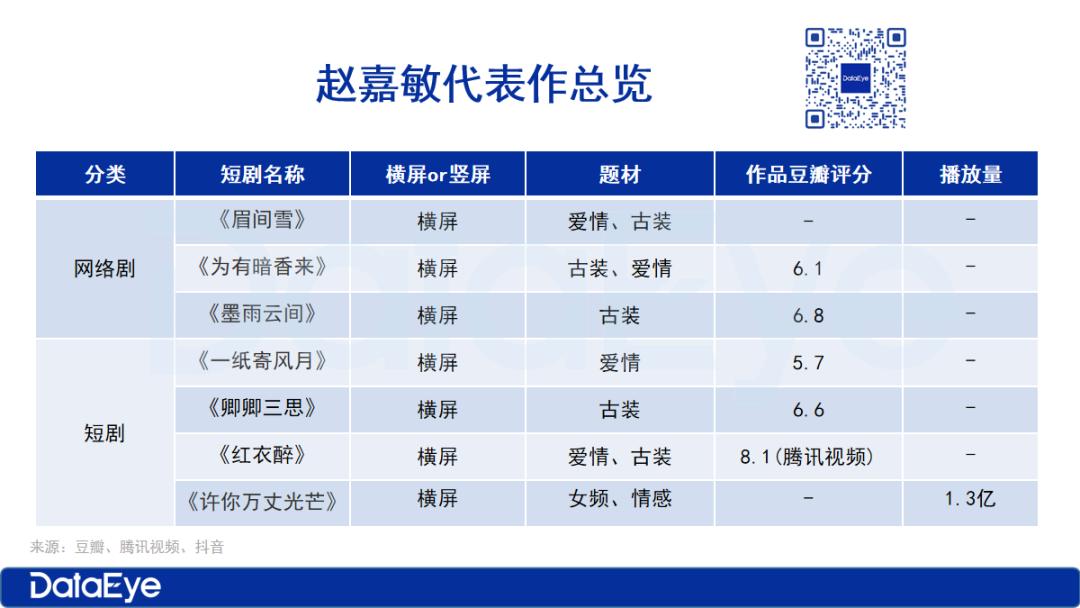 徐梦洁和赵嘉敏两人共同点较多,均为爱豆出身,在出演短剧之前,影视作品并不多,也大多为爱情片。两人出演的短剧都是以横屏迷你剧和品牌定制剧为主,赵嘉敏的作品多为古装剧,而徐梦洁的作品多为现代剧。