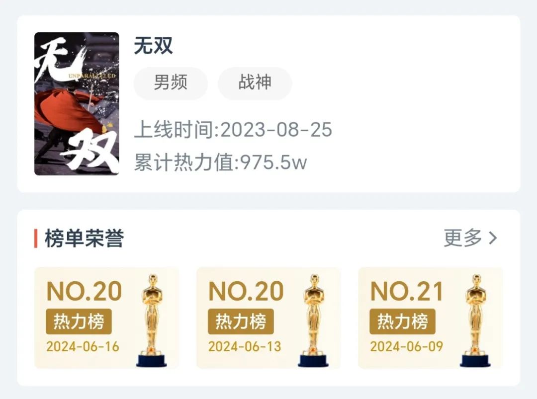 缴沛凯最为出圈的作品是男频短剧《无双》,上线24小时充值超过5500万元,8天后突破一亿。去年8月上线,至今火热,本月7次登上DataEye短剧热力榜TOP30。